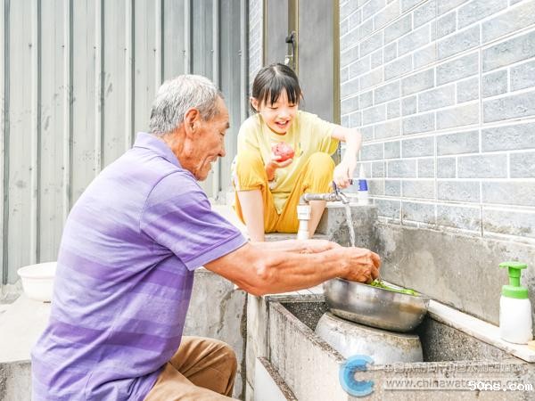 8月12日,简昌村村民郭罗照在自家院子里和小孙女一起用自来水清洗果蔬